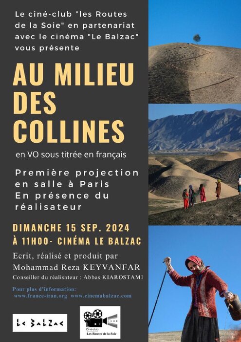 وبحسب تقرير العلاقات العامة للمركز الإيراني الفرنسي، سيتم عرض فيلم "بين التلال" للمخرج محمد رضا كيوانفر في نادي سينما "طريق الحرير" التابع للمركز الإيراني الفرنسي في سينما بلزاك في باريس.